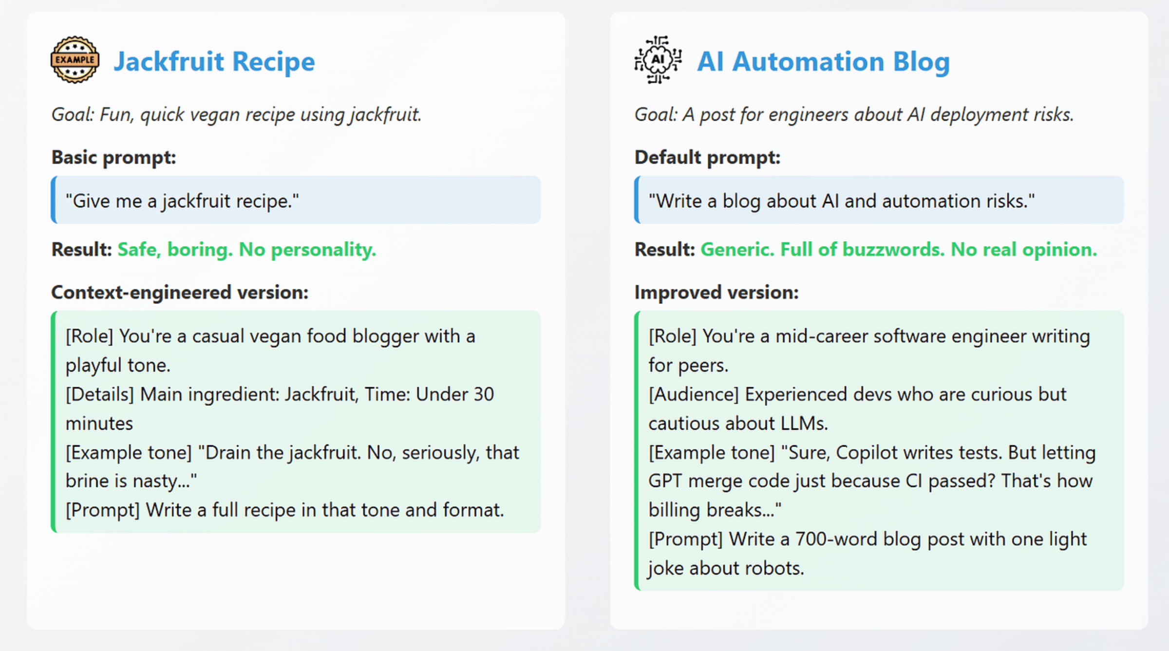 This structure makes prompts less brittle and more reusable—context engineering in action. ## Where Context Engineering Shines